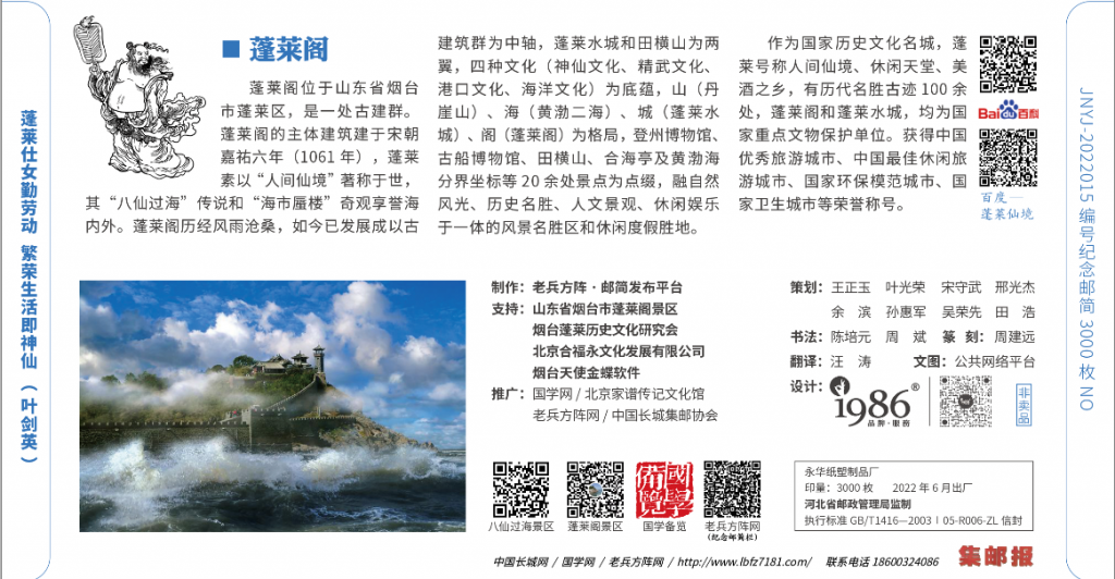本报讯(记者陈龙狮、通讯员曙笑华)八仙过海是在中国民间流传最广的神话传说之一。最近,一套让人眼睛一亮的《八仙过海·蓬莱阁》纪念邮简,由北京的老兵方阵·邮简发布平台悄然推出。邮简制作精美、内容丰富,海天一色的设计风格,为疫情下的炎热夏天注入一股清新和凉爽。